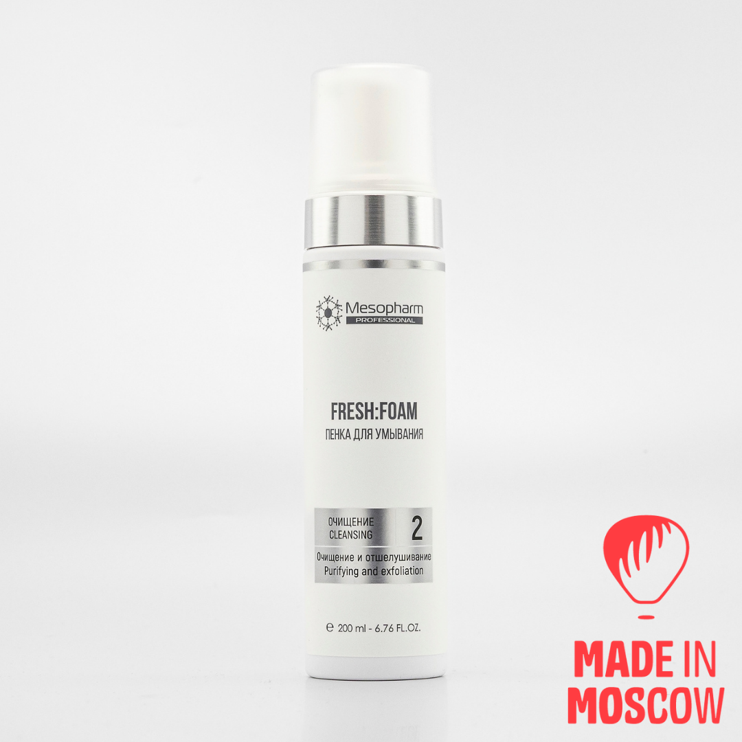 Cleansing foam FRESH:FOAM Volume: 200 mL Active ingredients: soft surfactants based on coconut oil and betaine, lactic acid, complex of сentella, juniper, hazelnut, witch hazel, sage and thyme extracts, α-glucan oligosaccharide, dipotassium glycyrrhizinate, allantoin. Effects: • gently removes excess sebum and water-soluble impurities • prevents the occurrence of inflammation • accelerates the process of natural exfoliation and cell renewal • regulates the activity of the sebaceous glands, promotes the narrowing of pores • improves the complexion Directions for use: Apply to wet skin. Massage gently with circular motions all over the face, including the eye contour area. Rinse thoroughly with water or remove the remains using a wet towel.