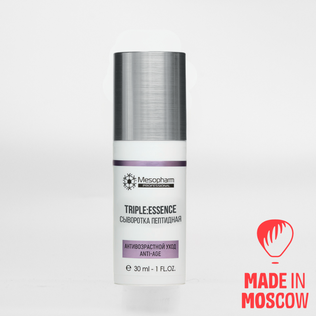 Peptide serum TRIPLE:ESSENCE Volume: 30 mL Active ingredients: peptide with a botulinum-like effect, matrikines, polysaccharide complex with α-glucan oligosaccharide, dipotassium glycyrrhizinate, Klotho rejuvenating factor peptide fragment, proteasome-activating peptide. Effects: • reduces facial stress, smooths fine wrinkles • improves skin turgor and evens out the texture • activates local skin immunity • has an anti-inflammatory effect • suitable for the eye area Directions for use: Apply on dry skin after cleansing, massage gently with sliding and tapping motions until the serum is completely absorbed. Apply a moisturising cream to enhance the effect.