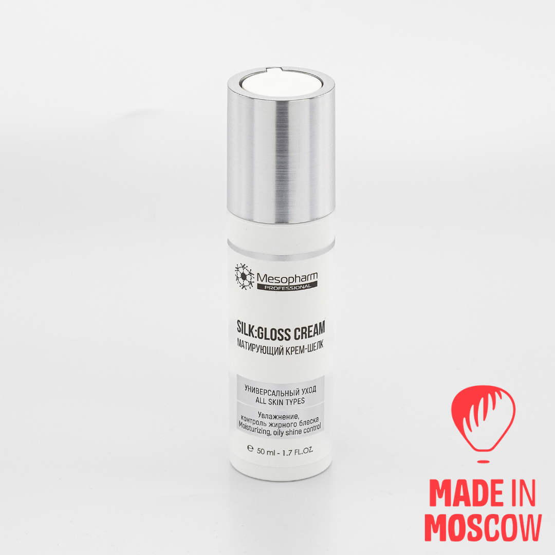 Mattifying cream-silk SILK:GLOSS CREAM Volume: 50 mL Active ingredients: betaine, dipotassium glycyrrhizinate, complex of A, C, E and F vitamins, jojoba oil, complex of sphingolipids and phospholipids, aloe leaf juice. Effects: • nourishes the skin, maintains its optimal level of moisture • gives the skin elasticity and silkiness • reduces inflammatory reactions, has a calming effect • protects against overdrying and exposure to unfavourable environmental factors • can be used as a foundation base Directions for use: Apply on dry skin after cleansing, massage gently with circular motions until the cream is completely absorbed.