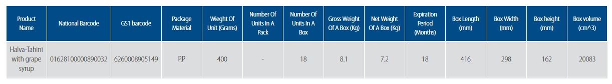 This natural product is obtained from mixing grape syrup and flavors like cardamom and vanilla which has all the nutrient qualities of the sesame and also has the great smell and taste of natural syrups and contains their nutrients such as carbohydrates, solutes and vitamins and all together, this product is an energy producer, useful and natural product which can be used for all age groups.