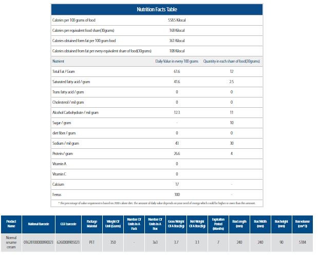 This product is produced from mixing Tahini obtained from grinding skinless, roasted sesame with sugar powder, emulsifier and appropriate flavors and finally scrubbing the mixture until a soft fiber is made. Sesame cream is a nutrient and very delicious product which is being produced in three different tastes: Normal, Chocolate and coffee. This product has a great ability of spreading on bread, biscuit and etc. and has got a beautiful and complete packaging. Sesame cream is an appropriate meal which can be used for all age groups especially children and students.