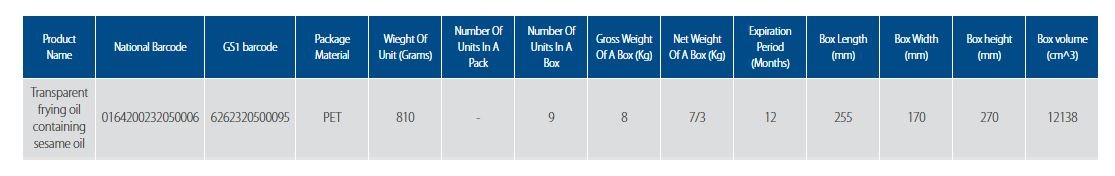 This product is a type of frying oil that sesame oil has been applied in its formulation. So, all the nutritional properties of sesame including essential fatty acids (omega-6 and omega-9) and natural antioxidants abound with the products. Moreover, due to the lake of palm oil, the appearance is transparent and free of trans fatty acids. High stability of the oil against oxidation is also adorable for deep and long frying.