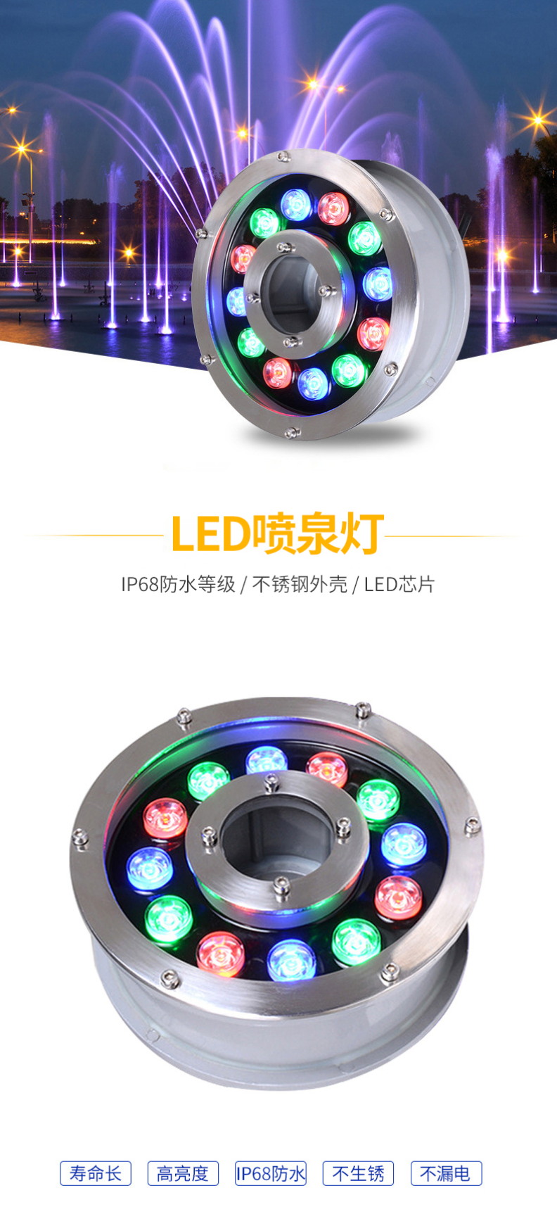 1.LED QTY:18pcs RGB SMD2835 2.Input voltage:12V.AC/DC 3.Power:1.2W 4.Dimension:φ63(45)*53mm 5.Material:PC+chrome ring 6.Length of cable: 0.5m,cables with connectors. 7.for SPA,bathtub,hot tub, wooden tub,foot barrel, massage tub, fautain, swimming pool,sauna room,steam room,whirlpool,jaccuzi, hydro-pool,under water etc