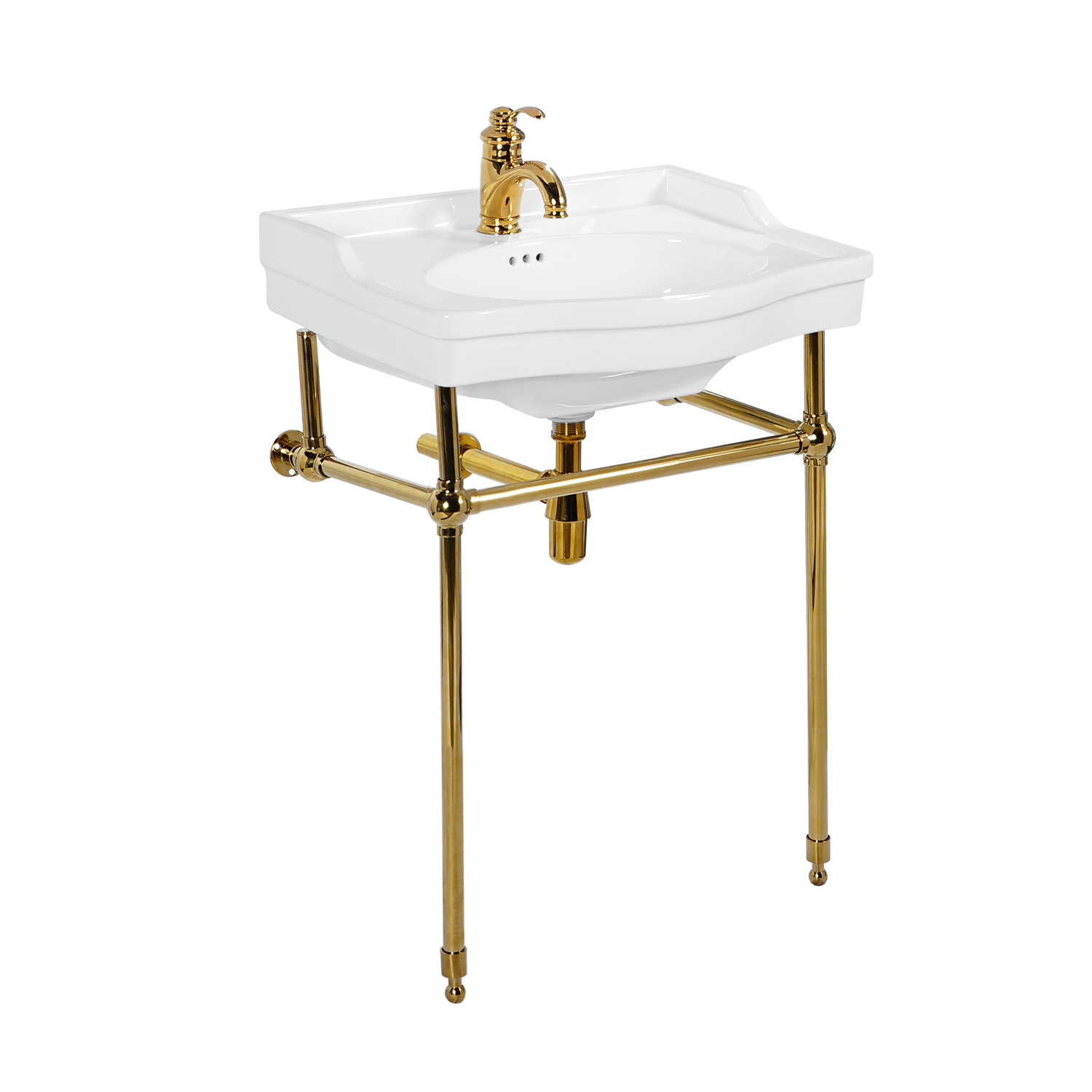 This stunning piece of bathroom 24-inch gold console sink features both modern and traditional stylings by combining the industrial style metal console stand and the classic rectangle shape master-crafted porcelain basin. This freestanding washbasin features protective and decorative backsplash and pre-drilled overflow to prevent water from flooding the floor, and the oversized basin top provides plenty of counter space for much comfortable daily usage. Pair with your favorite bathroom sink faucet to complete the look.