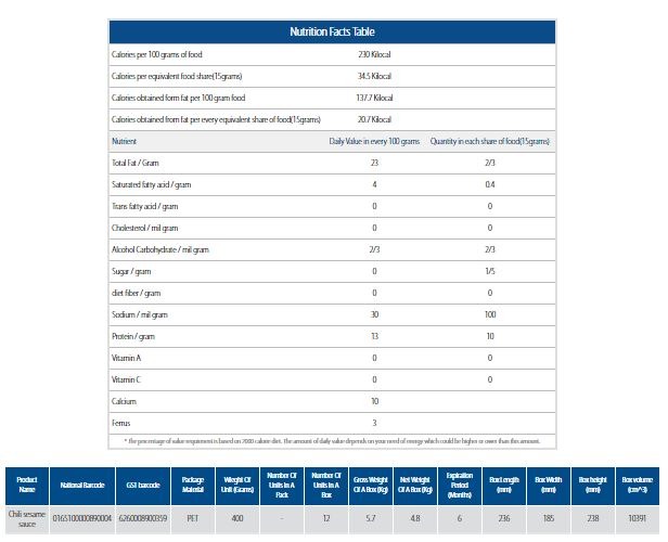 محصولی دیگر از خانواده سس کنجد که در فرمولاسیون آن علاوه بر ترکیبات اصلی تشکیل دهنده سس کنجد از جمله کنجد آسیاب شده(ارده)، از فلفل قرمز چیلی نیز استفاده گردیده است ، که ضمن ایجاد طعم تندی مطلوب ، موجب افزایش میزان ویتامین C و خواص آنتی اکسیدا