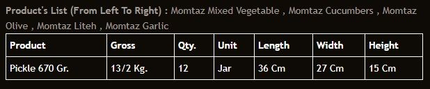 Product's List (From Left To Right) : Momtaz Mixed Vegetable , Momtaz Cucumbers , Momtaz Olive , Momtaz Liteh , Momtaz Garlic