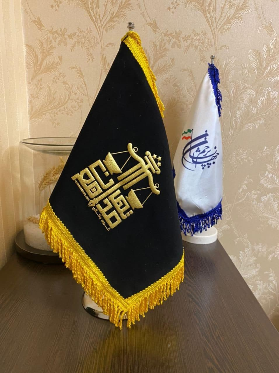تولید پرچم رومیزی دور لیزری و ریشه دوزی با پایه پرچم خاتم،استیل و سنگی