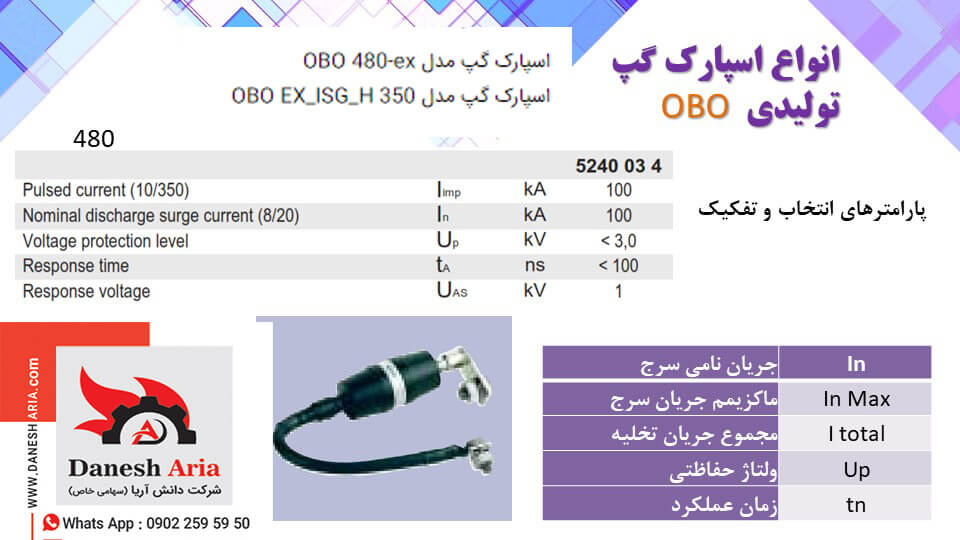 شرکت دانش آریا وارد کننده انواع اسپارک گپ های مورد نیاز سیستم های حفاظت کاتدی بوده که دارای نمایندگی شرکت OBO آلمان می باشد. لازم به ذکر است از نظر کارشناسان فنی شرکت آلمانی مدل 480 از رده تولید خارج شده و مدل ISG - H 350 جایگزین گردیده است و محصول جدید تری می باشد. دیتاشیت و مشخصات مربوطه در سایت شرکت دانش آریا موجود می باشد.