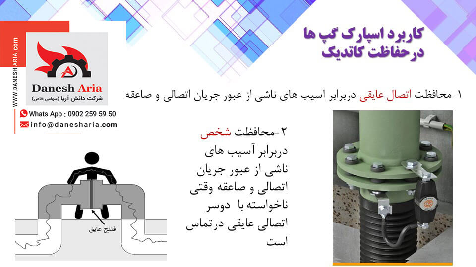 اسپارک گپ بر روی فلنچ هایی که دارای کیت عایقی هستند نصب می گردد. با توجه به اینکه واشرهای عایقی میانی کیت عایقی در برابر ولتاژ مشخصی مقاومت الکتریکی و فیزیکی دارند که ممکن است در هنگام صاعقه و یا خطاهای احتمالی گسکت (واشر عایقی میانی) صدمه ببیند. به همین دلیل برای حفاظت گسکت از اسپارک گپ استفاده می شود. عملکرد اسپارک گپ بدین صورت بوده که در هنگام بوجود آمدن خطا و یا صاعقه ، مسیر جریان را از مدار خود بسته ودر نتیجه آسیبی به کیت عایقی وارد نمی آید.کاربرد دیگر اسپارک گپ جلوگیری از ایجاد جرقه در دو لبه فلنچ می باشد که جلوگیری از این اتفاق در داخل محیط های مخاطره آمیز از اهمیت به سزایی برخوردار می باشد.