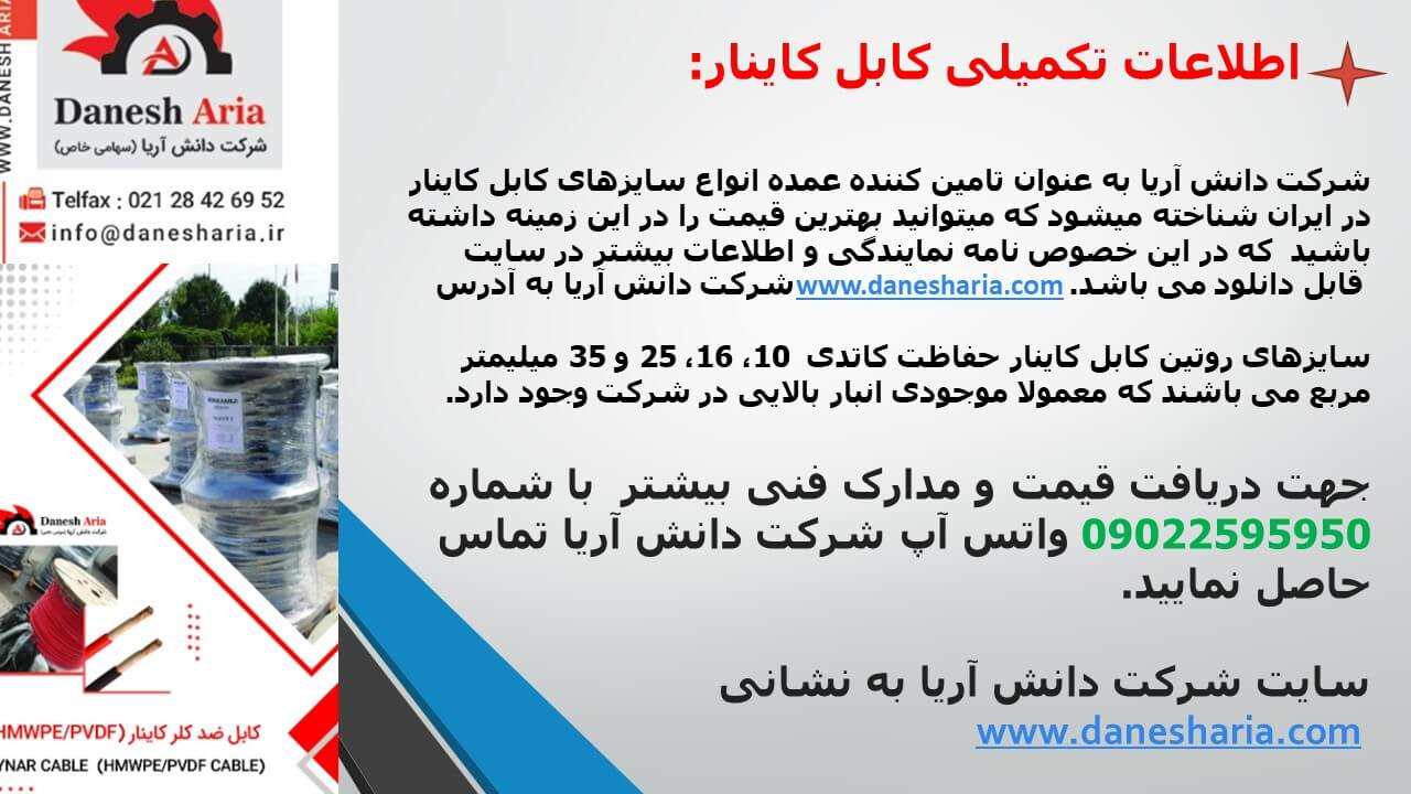 شرکت دانش آریا به عنوان تامین کننده عمده انواع سایزهای کابل کاینار در ایران شناخته میشود که میتوانید بهترین قیمت را در این زمینه داشته باشید که در این خصوص نامه نمایندگی و اطلاعات بیشتر در سایت شرکت دانش آریا به آدرس www.danesharia.com قابل دانلود می باشد.