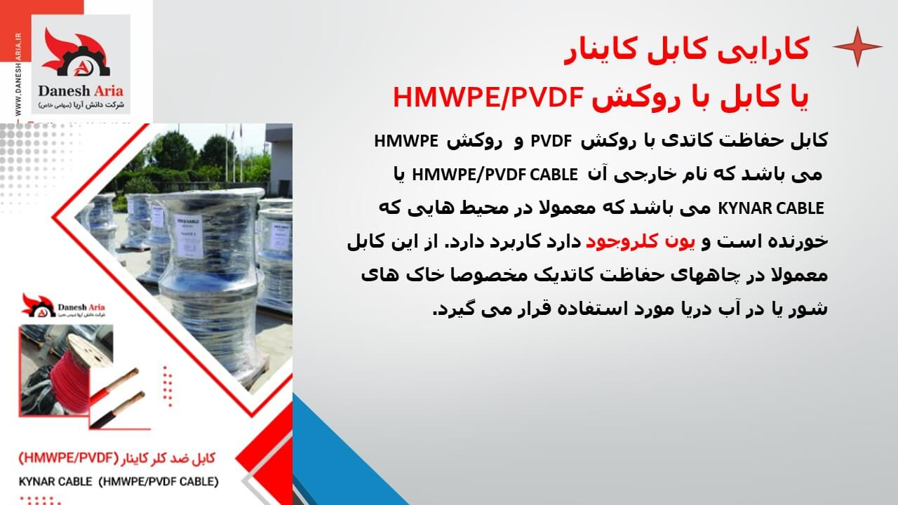 Kynar Cable (HMWPE/PVDF): در شرایطی که نیاز به بهبود مقاومت نسبت به خوردگی باشد، به عنوان مثال در بستر های عمیق، استفاده از کابل های دارای دو پوشش Kynar/HMWPE توصیه می شود. به طور تجربی، اصلی ترین علت عدم کارایی سیستم در چاههای عمیق، کابل آند می باشد. با اعمال جریان مثبت در آندهای حفاظت کاتدی، مقدار زیادی گاز کلر تولید می شود که این گاز مخرب بوده، که باعث تخریب عایق کابل و در نتیجه منجر به خرابی کابل مسی و در نهایت از دست رفتن آند در سیستم حفاظت کاتدی می شود. در کابلهای دارای دو روکش (HMWPE/PVDF)، روکش خارجی که از HMWPE استاندارد تشکیل شده است، سبب ایجاد خواص فیزیکی بسیار مطلوبی نظیر مقاومت به سایش می شود. لایه داخلی که مقاومت بسیار بالایی در مقابل یون کلر دارد، از یک دیواره همگن PVDF فلوئورو پلیمری (PVDF) تشکیل شده است. همچنین Kynar مقاوم به بسیاری از مواد شیمیایی نظیر اسید هیدروکلریک و اسید سولفوریک است.