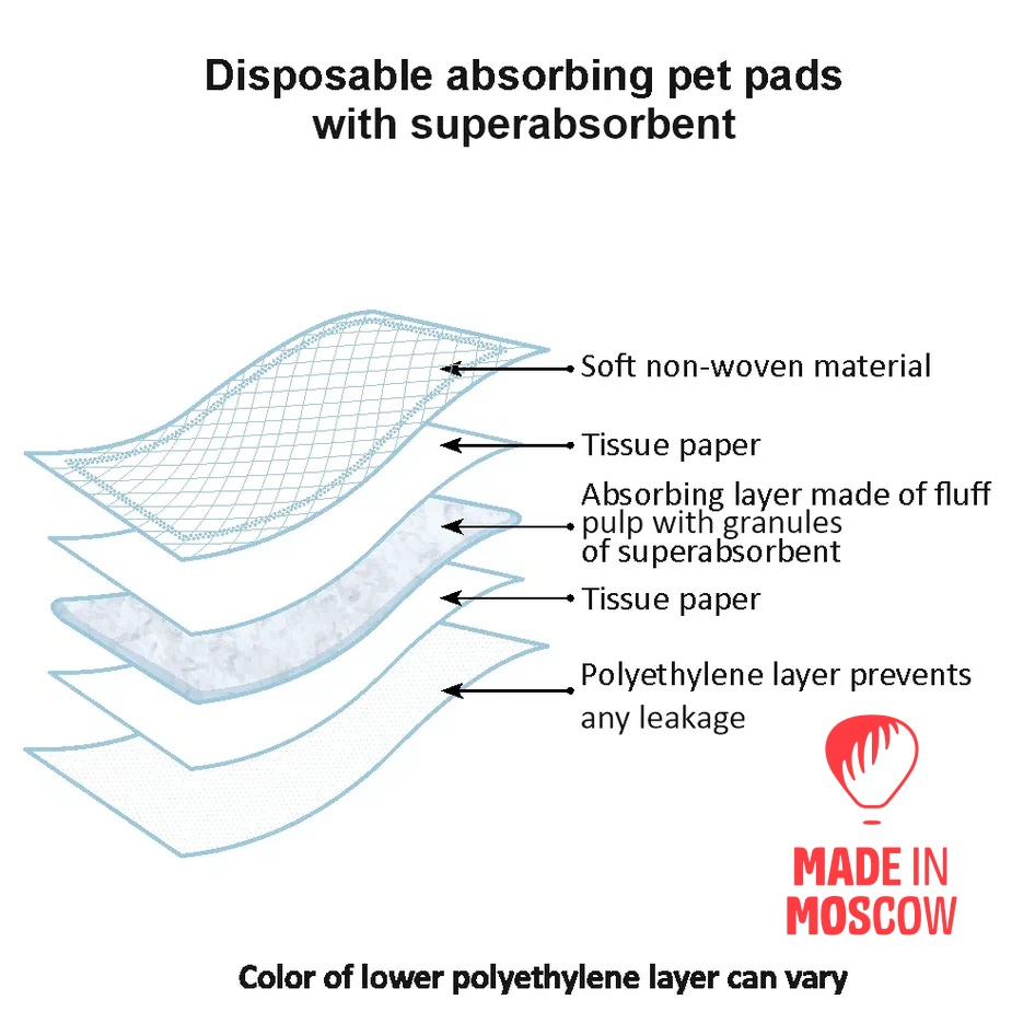 Pet pads of this series have granules of superabsorbent that turn liquid into gel, so the surface of the pad and animal paws stay clean! The pet pads are also able to absorb much more liquid due to thickened absorbing layer.