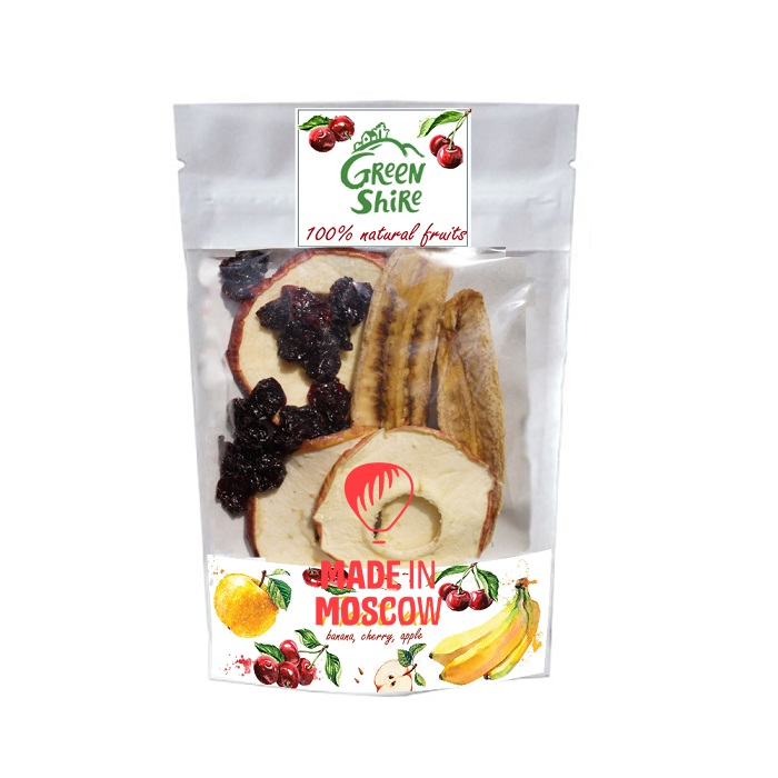 Just like the mix with orange, the combination of banana with apple and cherry is considered a classic and very popular with buyers all over the world. Bananas protect our body from strokes and hypertension, help control weight, because they have a low glycemic index, and support immunity. Bananas are considered a rich source of carbohydrates, they contain B vitamins (B1, B2, B6), vitamins C and P for strengthening immunity. Cherry fruits contain potassium, calcium, phosphorus, magnesium, copper, iron, as well as enzymes, anthocyanins, glucose, fructose), vitamins A, C, B2, PP, P, folic acid, coumarin. Vitamin mix with banana and cherry is a tasty and healthy snack for both children and adults.