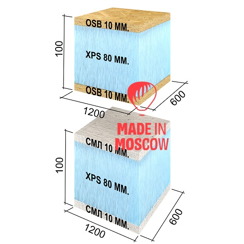 The RPG sandwich must be used to create a reliable, insulating base on frame structures ready for finishing. The RPG sandwich is a structure made of extruded polystyrene XPS (insulating material) + SML (glass-magnesium sheet) or OSB (oriented strand board). The XPS layer gives the sandwich structure excellent, adjustable (by varying thickness) insulating properties. A layer of SML or OSB gives the structure planar rigidity and preparation for further finishing work. The operating temperature range of the sandwich is from -50 to +75 *C and can be used for indoor, outdoor and wet areas. The RPG sandwich is light in weight and does not overload the structure of buildings, covering significant spans and withstands heavy fracture loads. Due to the extruded polystyrene filler, the sandwich is reliably and quickly glued together, along the joint with polyurethane-based mounting adhesive, creating the integrity of the insulating layer.