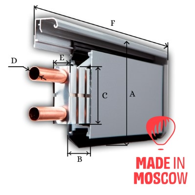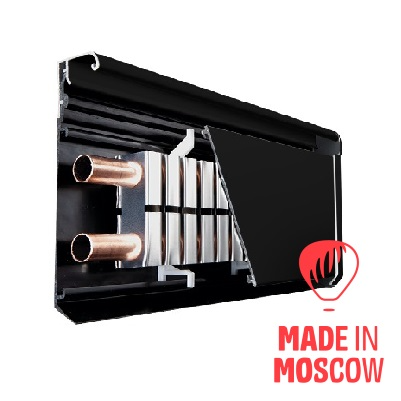 The heating module is located in a housing, which consists of a heat-resistant back strip and aluminum strips: upper and closing. The heating module is mounted inside the box using brackets. Crimp fittings, 90° flexible corner connectors and 180° copper loop fittings are supplied with the warm baseboard to connect the heating part. Charley” warm water skirting board allows assembling connections by soldering, for which standard soldered elements for 15 mm copper pipe are used.