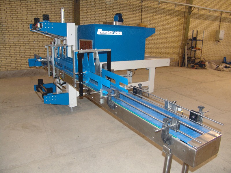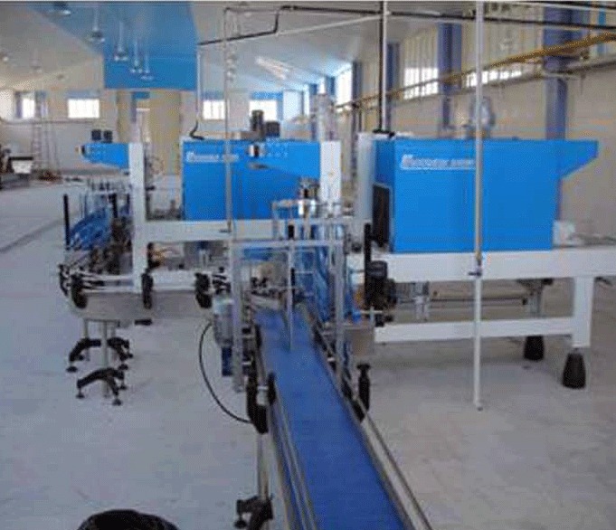 The bottle pack is wrapped with nylon pack while passing through welding gate and it enters inside the tunnel for shrinking.