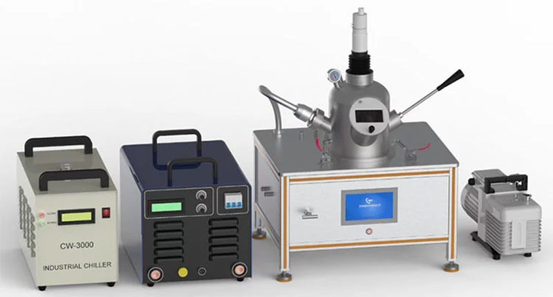 This product is a small vacuum arc melting furnace with tungsten electrodes and water-cooled copper crucible. The equipment melting temperature can exceed 3000ºC, and the temperature is reduced rapidly. The equipment adopts stainless steel water-cooled chamber and is equipped with a quartz observation window to observe the sample melting condition, which is very suitable for sample melting and heat treatment, phase diagram research. During smelting, the metal is placed in the water-cooled copper crucible. According to the process requirements, the furnace can be filled with high-purity inert protective gas, and the high-temperature plasma generated by the arc is used to melt the metal. Multi-station copper crucible can be used for a variety of small metal (about 3g ~ 5g per station) smelting in sequence, with the side control lever for tilting and rotating metal ingots after smelting. There is a larger cavity in the middle of the copper crucible for mixed smelting of the alloy (which can hold about 25g). The smelting furnace is also equipped with a vacuum suction casting mold. The user can replace and install it by simple tools. After replacement, the vacuum suction casting function can be realized. The cylindrical metal sample can be made to facilitate subsequent cutting, clamping and analysis operations.