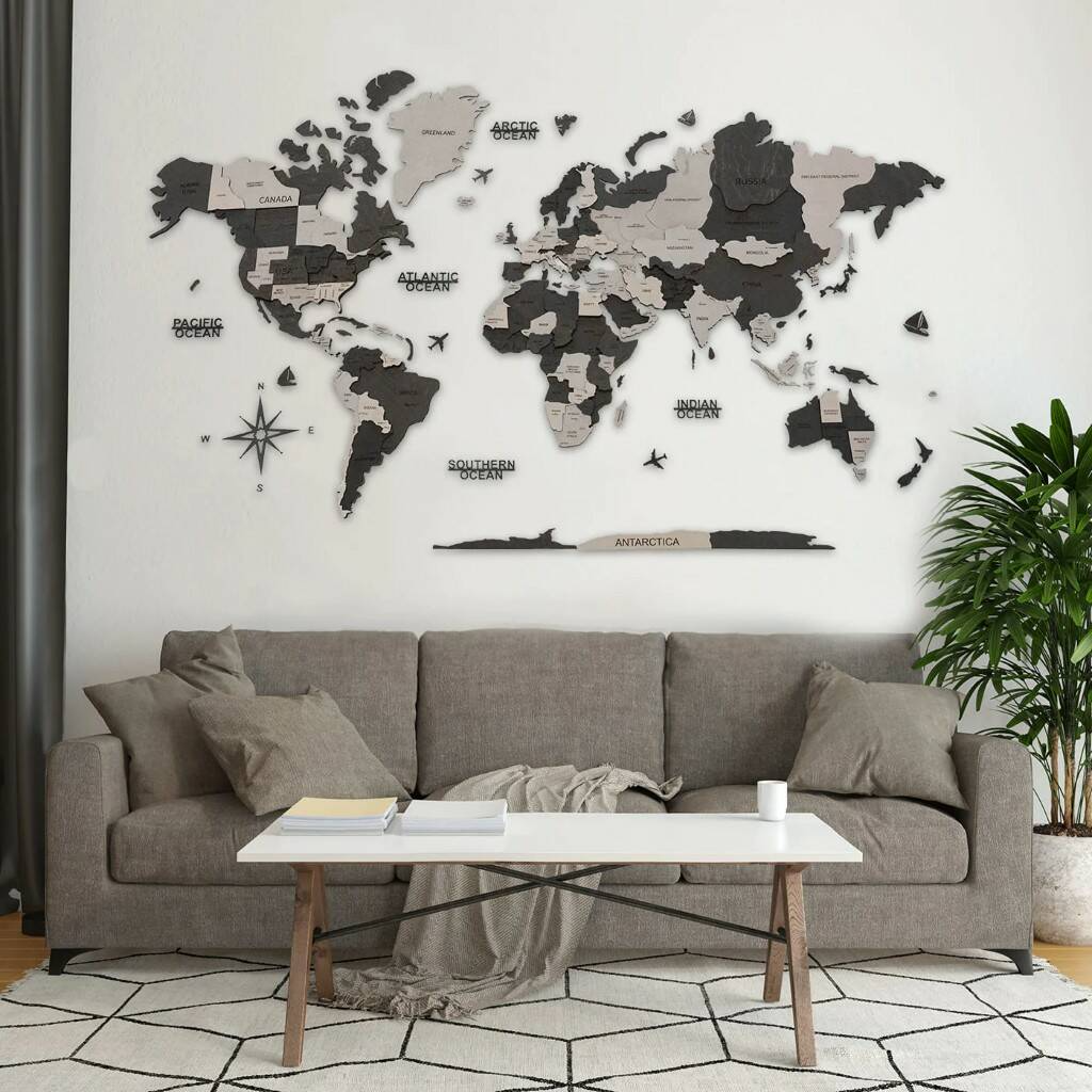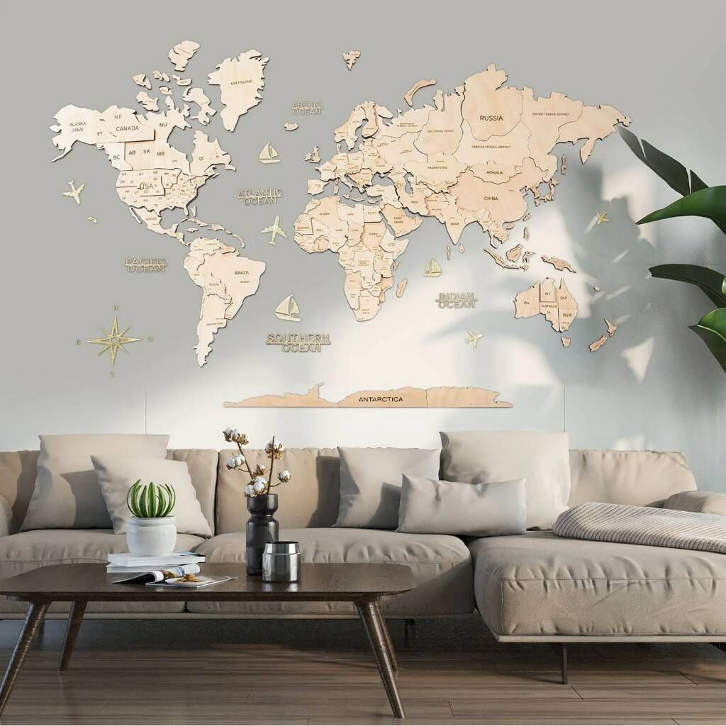 Our product is a handmade item. We pay attention to every detail, we choose the best birch plywood and use unique paint which completely saves the texture of the wood. Elements of the map are sticked on the wall with adhesive tape, the principle is similar to double-sided tape, but the tape is denser and more reliable. The tape comes with the map.