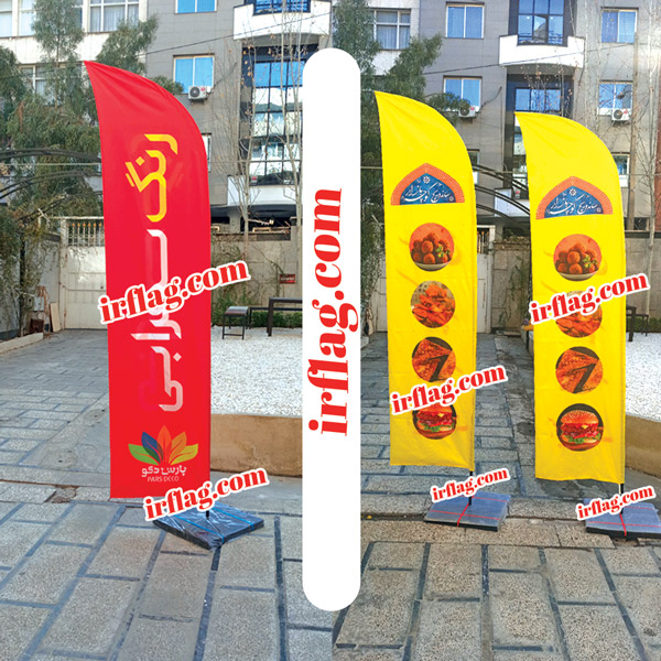 Special sailing beach flag for installation at the entrance of commercial service centers to introduce your product or organizational brand with digital flag printing and satin and Rachel flag fabric in two sizes of 3 meters and 2 meters with a granular flag base.