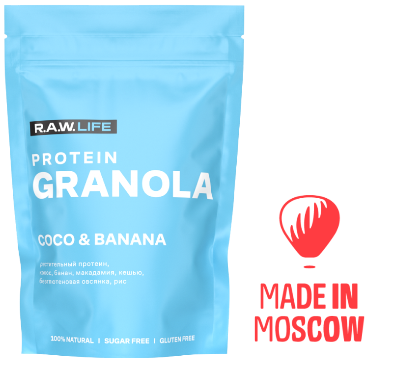 گرانولای پروتئینی سالم. وقتی به طعم RAW LIFE PROTEIN COCO & BANANA رسیدیم، رویای آن را داشتیم که قبل از موج سواری در استرالیا صبحانه بخوریم. نارگیل، طعم ماکادمیا خامه ای و موز شیرین در تکه های بزرگ - این گرانولا با یک رویا زیر درختان نخل اختراع شد.