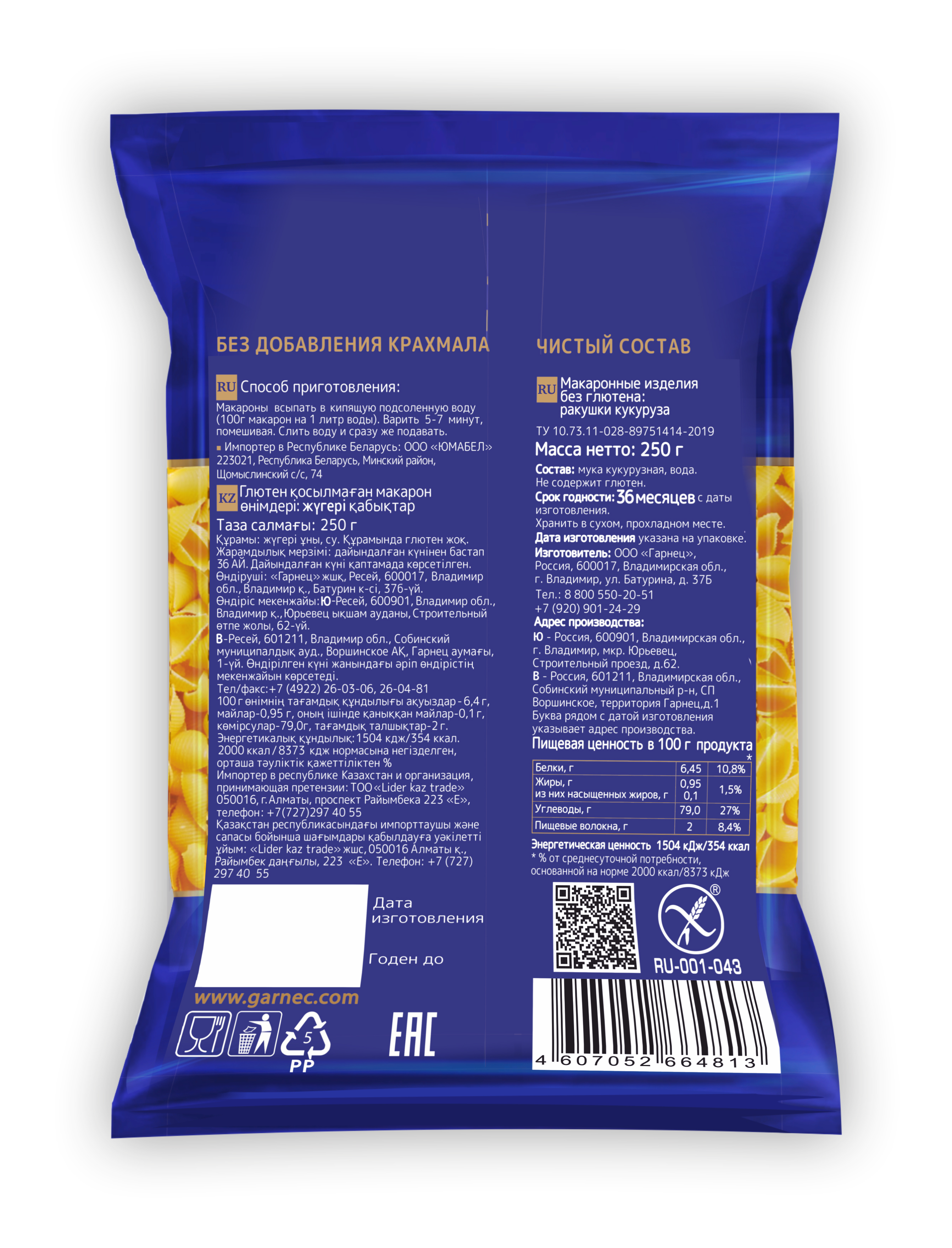 پاستا TM "Garnec" حاوی نشاسته گندم، لاکتوز، شیر، تخم مرغ و مواد نگهدارنده نیست، طعم منحصر به فرد و محتوای فیبر بالایی دارد. محصولات پاستا "گارنک" نمیجوشند. این محصول فاقد گلوتن است. عدم وجود گلوتن در هر مرحله از تولید بررسی می شود.