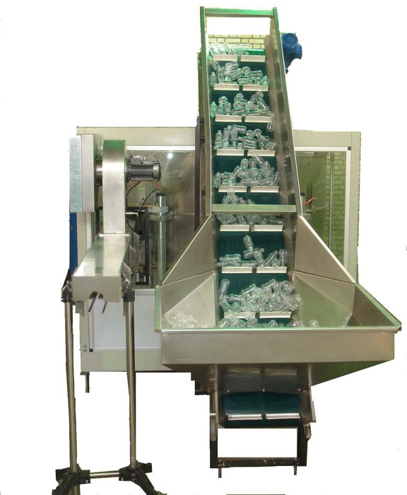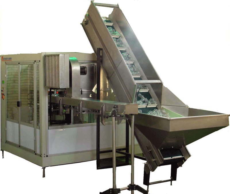 مشخصات: دارای یک مخزن با نوار بالابر جهت رساندن بطری به مخزن اصلی ماشین می باشد. ظرفهای ردیف شده توسط ریل بادی (Air Conveyor) از ماشین خارج می شود. قسمتهای ظاهری ماشین از استنلس استیل 304 ساخته شده است. ماشین دارای اطاقک ایمنی می باشد.