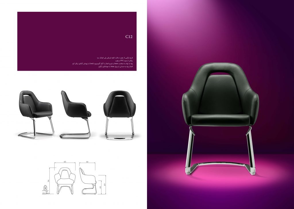 فریم ترکیبی از چوب و فلز با فوم تزریقی پلی اورتان سرد روکش از چرم PVC مرغوب پایه از لوله به ضخامت mm 2 و فریم اتصال با آلیاژ آلومینیوم (Lm2) با پوشش آبکاری نیکل کرم اتصال پایه به صندلی از ورق mm 5 با جوشکاری آرگون