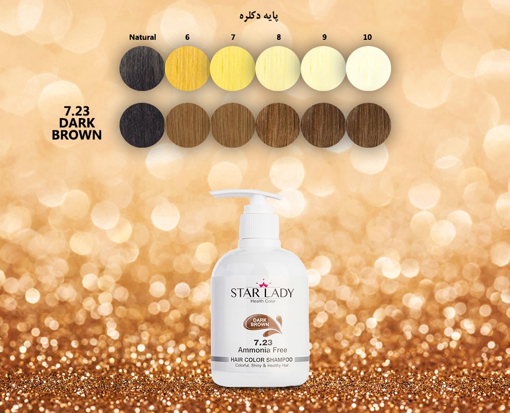رنگ قهوهای رایجترین رنگ مو در بین بانوان با هر شرایط سنی و هر رنگ پوستی است؛ اما استفاده از بسیاری از رنگ موها جهت رنگ آمیزی مو موجب آسیبدیدگی بافت مو شده و عوارضی همانند خشکی و زبری مو را به همراه دارد. برای حفظ سلامت بافت و ساختار مو و مراقبت از آنها در هنگام رنگآمیزی، شرکت استارلیدی شامپو رنگ را به بازار عرضه کرده است. این شامپوها فاقد آمونیاک بوده و بدون استفاده از اکسیدان، موهای فرد را به رنگ دلخواه تغییر میدهند. از مناسبترین رنگهای این شامپوها، رنگ قهوهای تیره به شماره 7.23 بوده که رنگ قهوهای دلنشینی را به موهای فرد میبخشد. برای رسیدن به این رنگ میبایست شامپو را بر روی موی بلوند یا بلوند روشن (دکلره پایه 7 و 8) قرار داده و پس از 10 دقیقه شستوشو داد. همچنین استفاده از «شامپو رنگ استار لیدی مدل Dark Brown شماره 7.23 حجم 300 میلی لیتر» بر روی موهای طبیعی جهت رسیدن به رنگ قهوهای و نیز پوشش موهای سفید پیشنهاد نمیشود. اصلیترین مزیت رسیدن به رنگ قهوهای با استفاده از شامپو رنگ استارلیدی نسبت به سایر رنگ موها، سهولت استفاده از آن و حفظ سلامت موی مصرفکنندگان است.