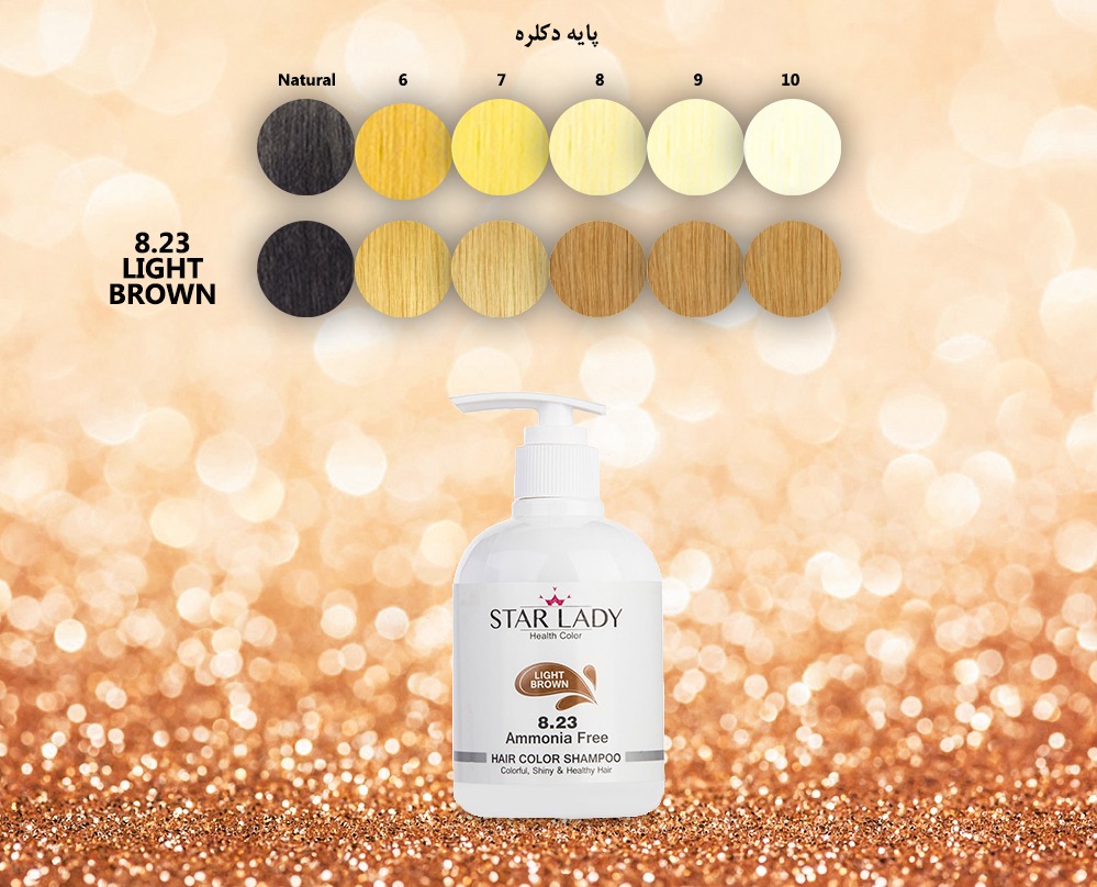 رنگ قهوه ای روشن مورد علاقه عموم بانوان با هر شرایط سنی و هر رنگ پوستی بوده و استفاده از این رنگ در بین بانوان بسیار رایج است. بدین منظور شرکت استارلیدی شامپو رنگ شماره 8,23 را برای طرفداران رنگ قهوه ای روشن به بازار عرضه میکند. این شامپو فاقد آمونیاک بوده و بدون استفاده از اکسیدان، قابلیت رنگآمیزی مو را دارد. این شامپو، رنگ قهوه ای روشن و دلنشینی را به موهای فرد می بخشد. برای رسیدن به این رنگ میبایست شامپو را بر روی موی بلوند (دکلره پایه 7) قرار داده و پس از 1۰ دقیقه شستوشو داد. استفاده از این شامپو بر روی مو با رنگ بلوند روشن (پایه دکلره 8 ) قهوه ای خیلی روشنی را نتیجه داده اما بر روی موی پایه 9 نتیجه مناسبی نخواهد داشت. همچنین از این شامپو برای رنگ کردن موهای طبیعی استفاده نمیشود. اصلیترین مزیت استفاده از شامپو رنگ استارلیدی نسبت به سایر رنگ موهای رایج در بازار، سهولت استفاده و حفظ سلامت موی مصرف کنندگان است.