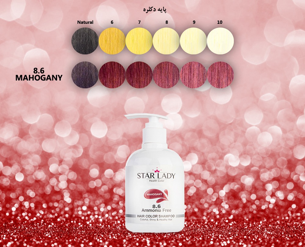 شامپو رنگ ماهاگونی برند استارلیدی، رنگ قرمز-چوبی بسیار دلنشینی را به مو داده و برای افراد با پوست روشن بسیار مناسب به نظر میرسد. از این شامپو برای رنگ کردن موهای دکلره و یا تمدید و شارژ مجدد موهایی که قبلا با رنگهای ماهاگونی و یا قرمز رنگ شده اند، استفاده می شود. مناسب ترین پایه مو برای رسیدن به رنگ دلخواه، پایه 8 (بلوند روشن) است. استفاده از شامپوی ماهاگونی بر روی مو با پایه روشن تر از پایه 8 (پایه 9 و یا 1۰) رنگ ماهاگونی کم رنگ تری را نتیجه داده و استفاده از آن بر روی موی پایه 7 (بلوند)، ماهاگونی تیره تری را نسبت به کاتالوگ خواهد داد. اما استفاده از شامپو ماهاگونی در موهای تیره تر از بلوند، نتیجه مطلوبی نخواهد داشت. همچنین استفاده از این شامپو بر روی موهای طبیعی توصیه نمی شود.