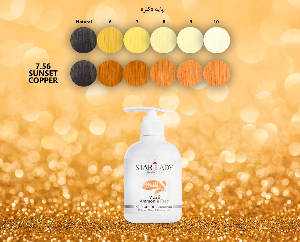 رنگ مسی غروب آفتاب با ترکیب طیف قرمز و طلایی طرفداران زیادی به ویژه در بین بانوان با پوست سفید و روشن دارد. شامپو رنگ مسی غروب آفتاب برند «استارلیدی» به شماره 7,56 برای رنگ کردن موهای دکلره شده استفاده می شود. برای رسیدن به رنگ دلخواه می بایست موی دکلره به رنگ بلوند (پایه 7) باشد. استفاده از آن بر روی موهای بلوند روشن (پایه 8) باعث می شود رنگ مسی غروب آفتاب کمرنگ تر و بر روی موی بلوند بسیار روشن (پایه 9) رنگ مسی بسیار ضعیفی نتیجه دهد. استفاده از این شامپو بر روی موهای تیره تر از بلوند و نیز موهای طبیعی نتیجه مطلوبی نخواهد داشت.