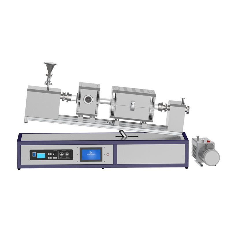 Single heating zone rotary PECVD, equipped with vacuum automatic feeder, and KF40 interface reserved at the end of the furnace tube can be connected to the receiving tank. The feeder adopts screw feeding, the p