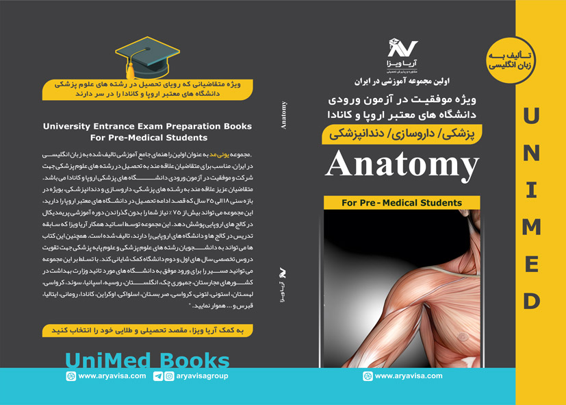 علم تشریح انسان جزء مهم علوم پایه پزشکی است. کتاب آناتومی در 4 فصل و به زبان انگلیسی توسط گروه آریا ویزا به نام کتاب های یونی مد – UniMed تالیف شده است. کتاب ها و پکیج های یونی مد – UniMed با استانداردهای آزمون های ورودی دانشگاه های پزشکی اروپا و کانادا و توسط اساتید بین المللی و با تجربه تالیف و گردآوری شده است و پاسخگوی بخش اعظم نیازهای مخاطبان ایرانی است.