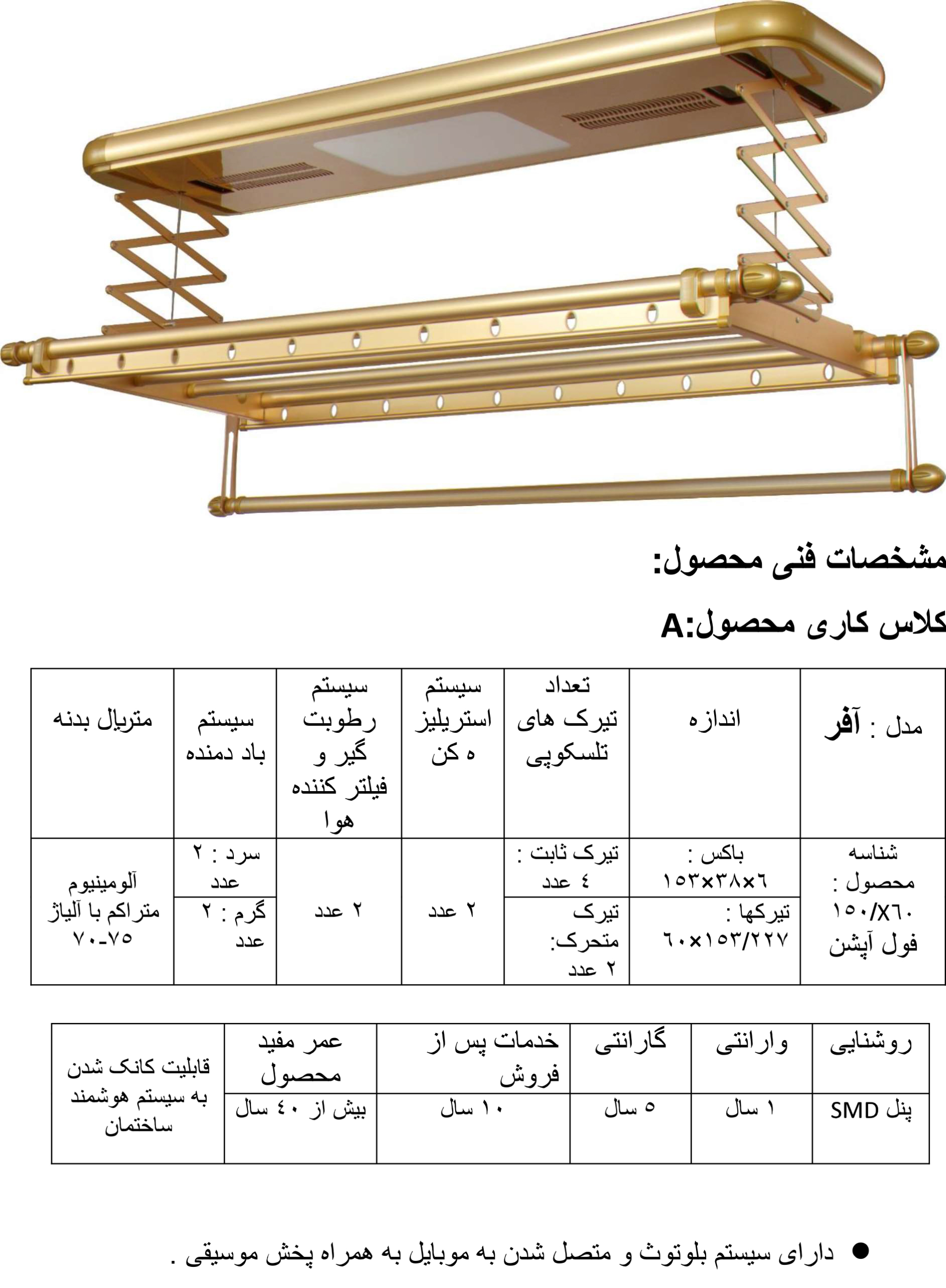 این محصول که زیر نظر مهندسین و طراحان صنعتیِ متخصص، طراحی و تولید گردیده، تمامی مشکلات موجود جهت آویز و خشک کردن لباس در زندگی آپارتمانی را حل نموده است و با توجه به قابلیتها و مزایایی که داراست تاکنون مورد توجه و رضایت خریداران و مصرفکنندههای آپارتماننشین، آرایشگاهها ، هتلها و… قرار گرفته است.