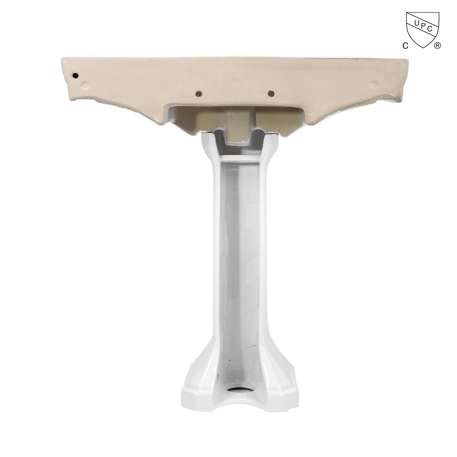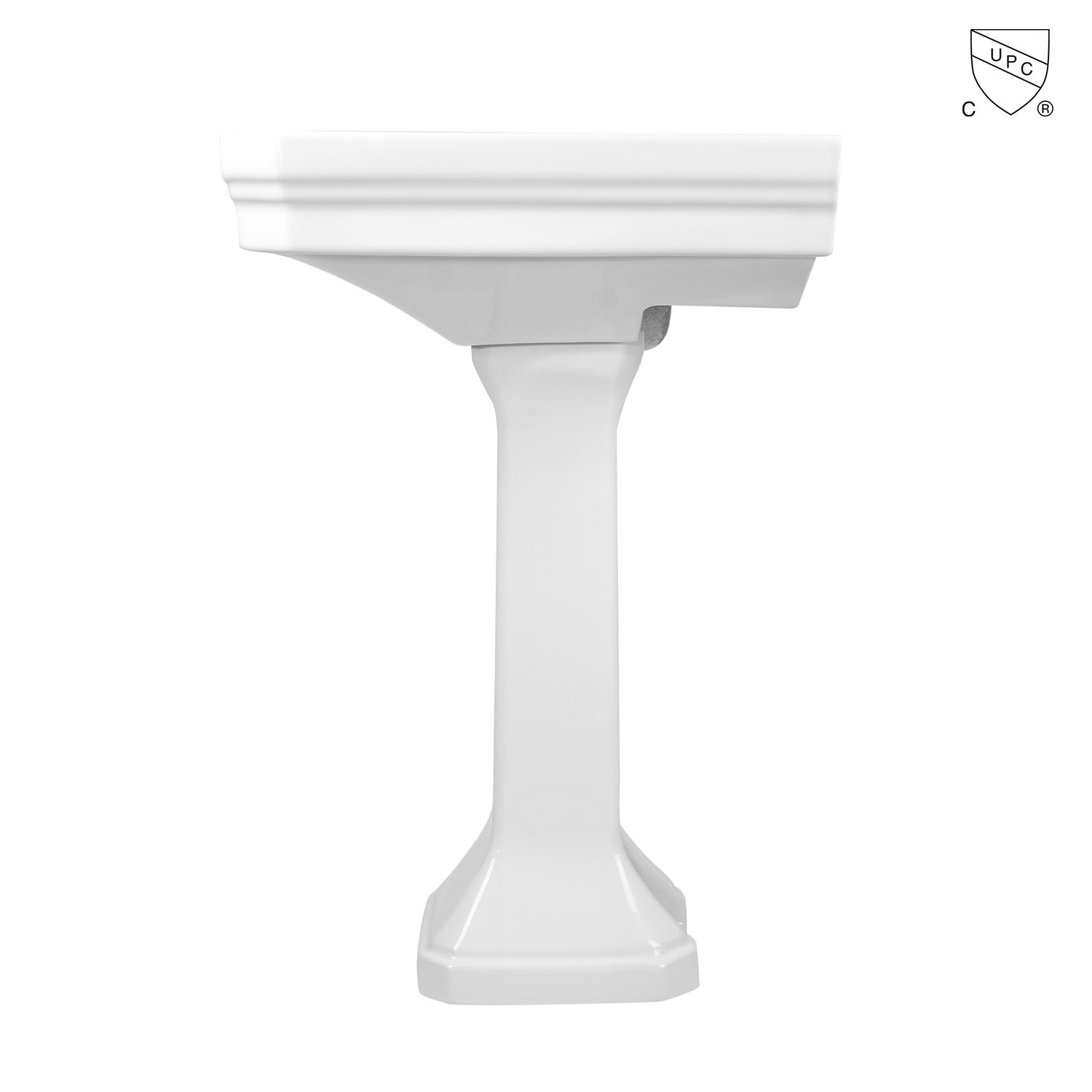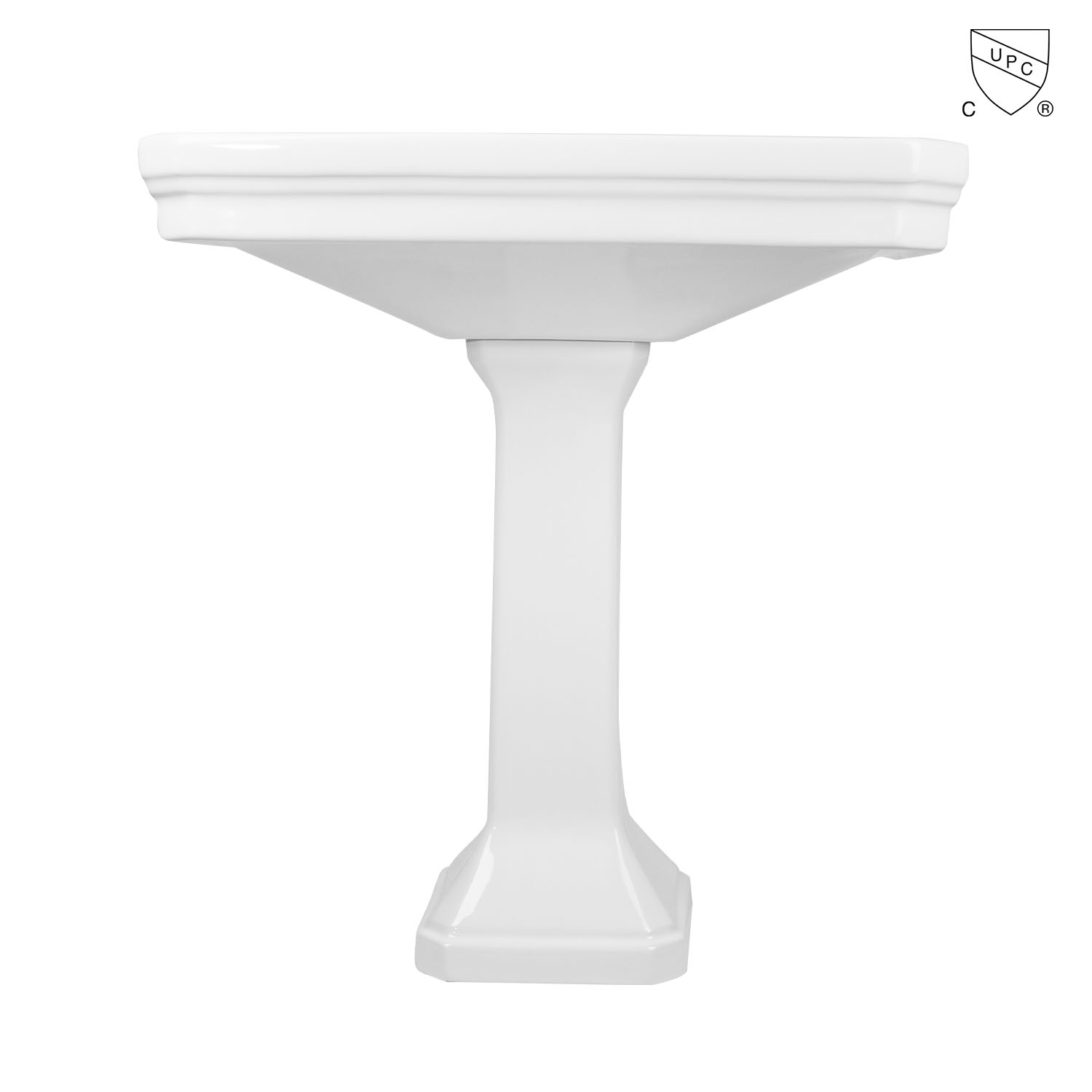 This oversized 32-inch rectangle bathroom pedestal sink features a large basin with plenty of counter space, perfect for soap dispensers or other bath items. Numerous stepped straight lines cover many sections of this vitreous china bathroom sink. The rectangle shape and deep basin makes the sink suitable for both contemporary and antique-themed bathrooms. Pair this 32-inch pedestal sink with your choice of widespread faucet to complete the look.