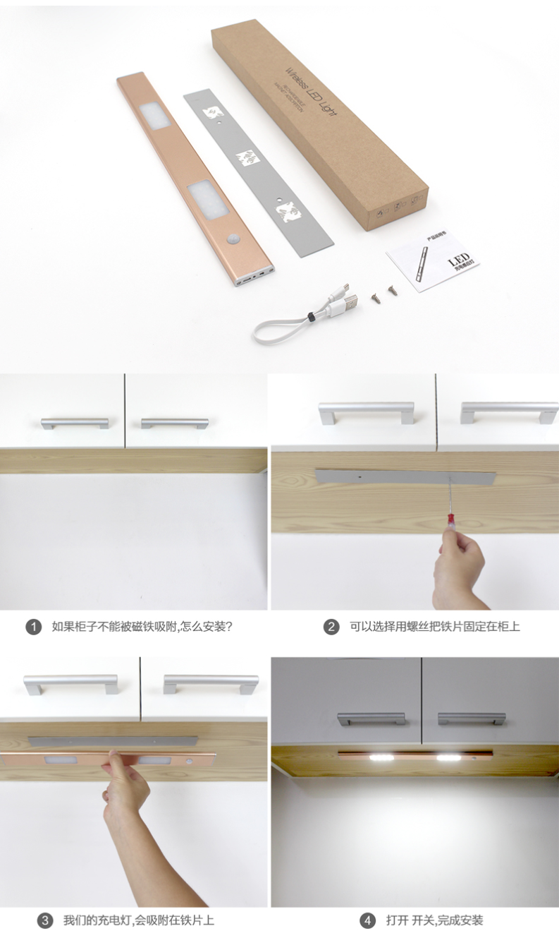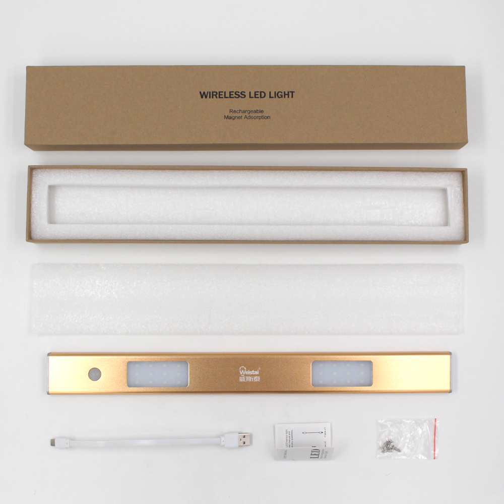 Model:WST-1816-CD6-GB Application :cabinet wardrobe cupboard,closet desk,bathroom cabinet stick on anywhere you want .Material:ultral thin alumnum.Size:customized length*40*8 mm。Features:build in lithium battery ,rechargeable,PIR sensor ,hand sweep sensor,approaching sensor ,magnetic adorption, easy installation,high quality.